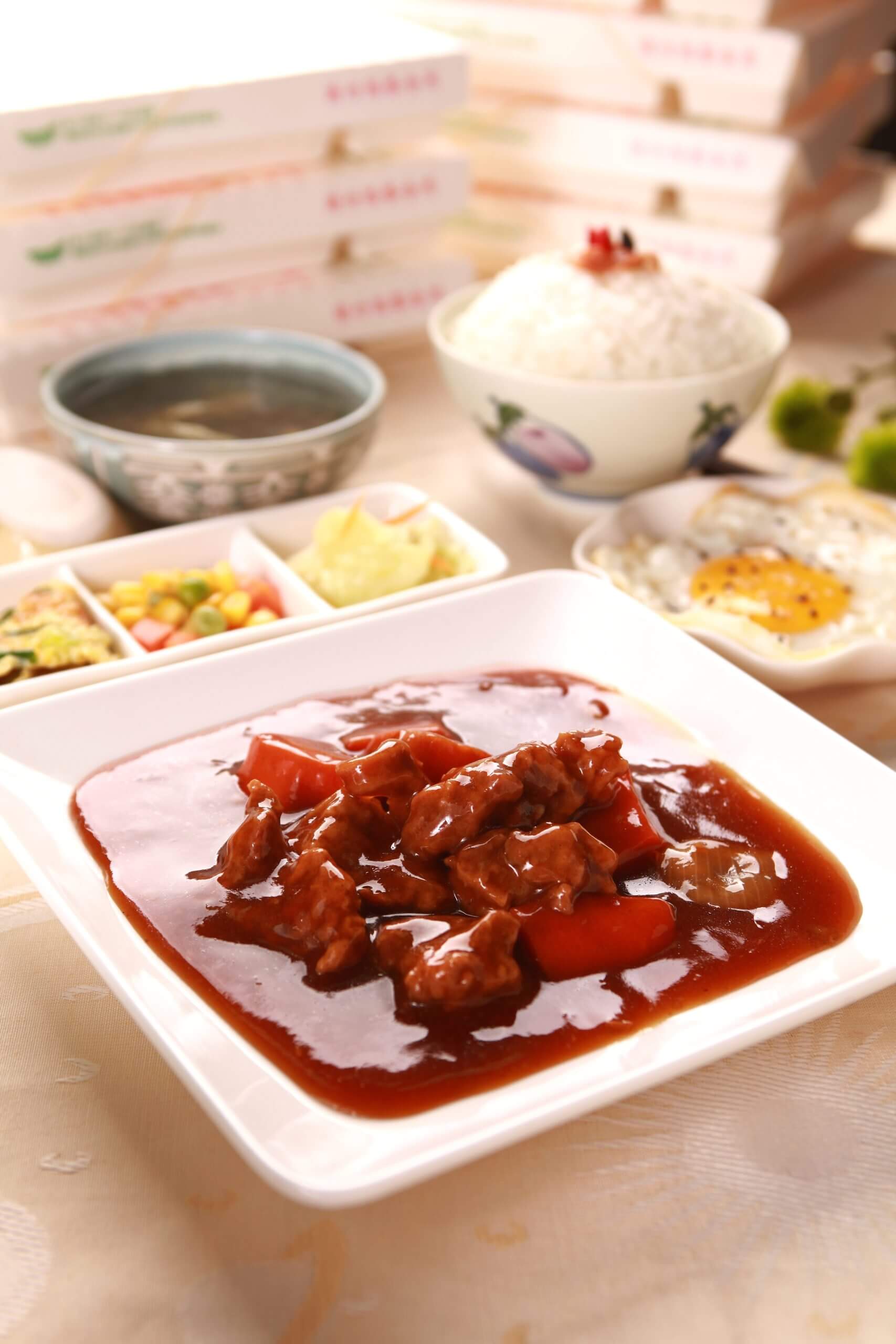 四項配菜+白飯+小劉自製紅燒牛肉調理包的組合。